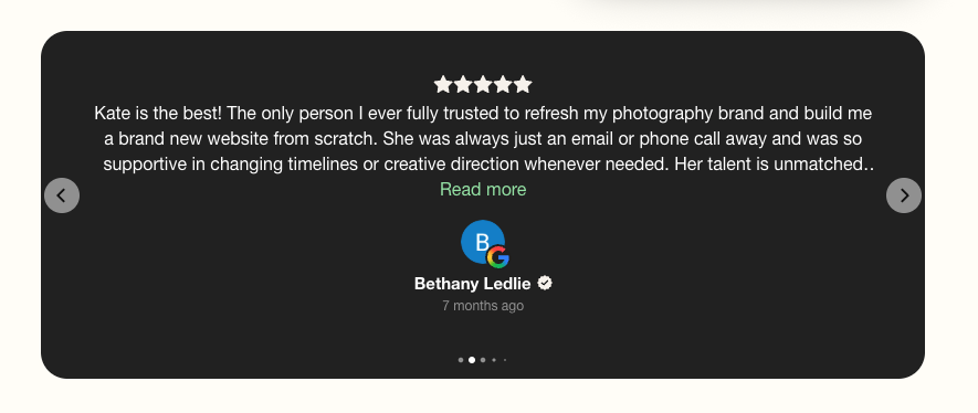 Instead of manually placing testimonials, a live review widget pulls directly from your Google Business profile and displays them on your site in real time.